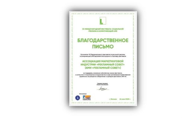 «Оргкомитет XV Международного фестиваля социальной рекламы и коммуникаций Lime выражает благодарность партнёру фестиваля Ассоциации маркетинговой индустрии «Рекламный Совет» за поддержку, оказанную юбилейному сезону фестиваля, и успешное и плодотворное сотрудничество в ходе организации торжественной церемонии награждения победителей и призёров фестиваля Lime XV».